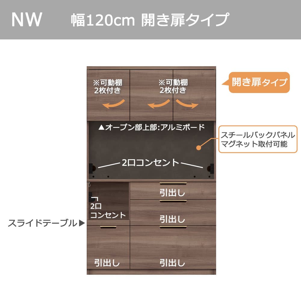 ナチュラルなインテリアに馴染む木目柄で統一されたデザインのNWシリーズ。使い勝手の良い引出し収納と家電収納に加えて、バックパネルにはマグネットを取付けることができ、お好みのマグネット収納を取り入れることが出来ます。壁面収納のようなフラットなデザインですっきりとした印象の開き扉タイプです。