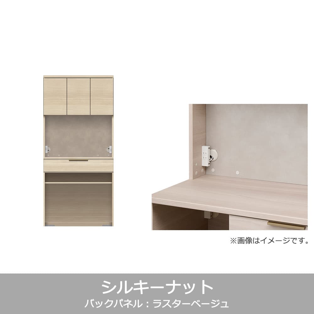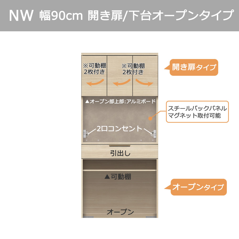 ナチュラルなインテリアに馴染む木目柄で統一されたデザインのNWシリーズ。使い勝手の良い引出し収納と家電収納に加えて、バックパネルにはマグネットを取付けることができ、お好みのマグネット収納を取り入れることが出来ます。壁面収納のようなフラットなデザインですっきりとした印象の開き扉タイプです。