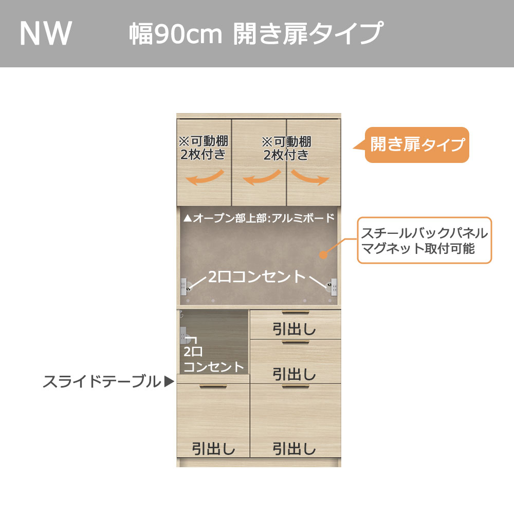 ナチュラルなインテリアに馴染む木目柄で統一されたデザインのNWシリーズ。使い勝手の良い引出し収納と家電収納に加えて、バックパネルにはマグネットを取付けることができ、お好みのマグネット収納を取り入れることが出来ます。壁面収納のようなフラットなデザインですっきりとした印象の開き扉タイプです。