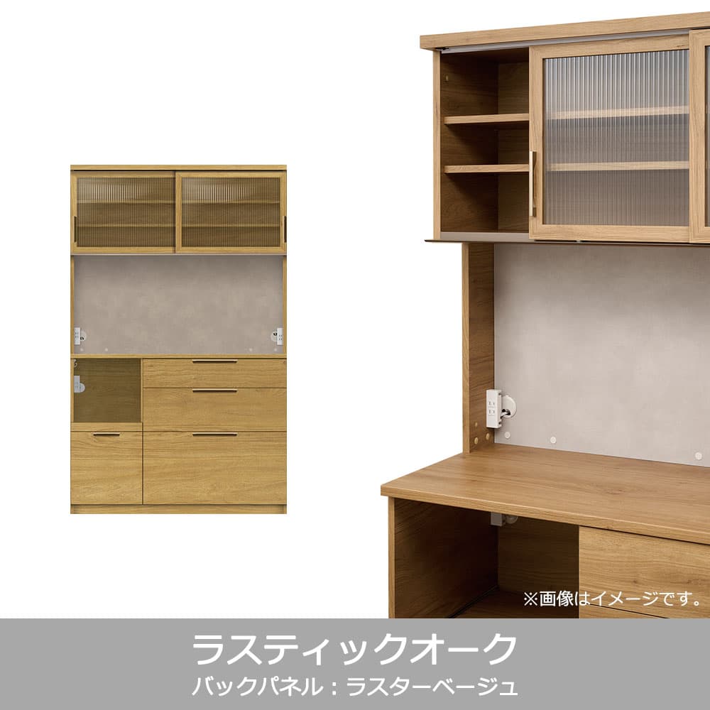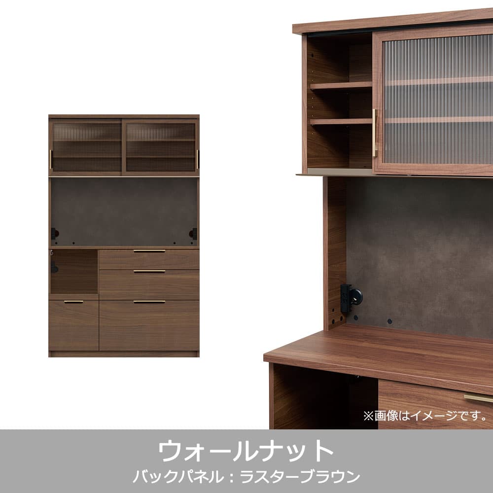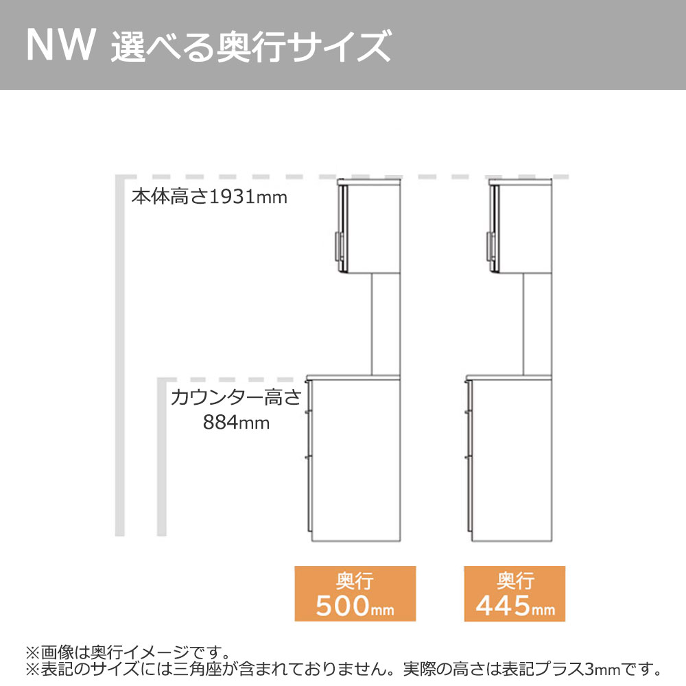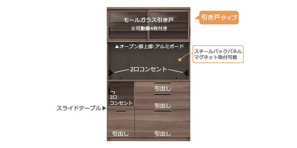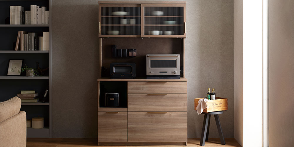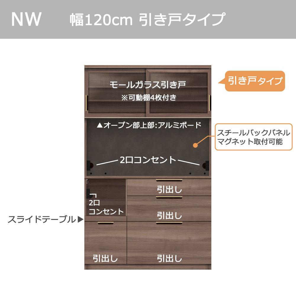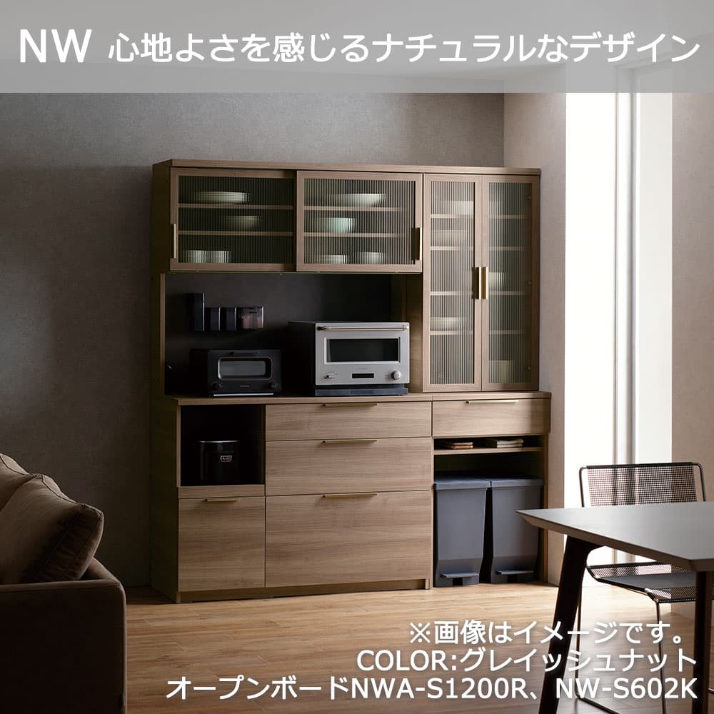 ナチュラルなインテリアに馴染む木目柄で統一されたデザインのNWシリーズ。使い勝手の良い引出し収納と家電収納に加えて、バックパネルにはマグネットを取付けることができ、お好みのマグネット収納を取り入れることが出来ます。モールガラスが優しい印象の引き戸タイプです。