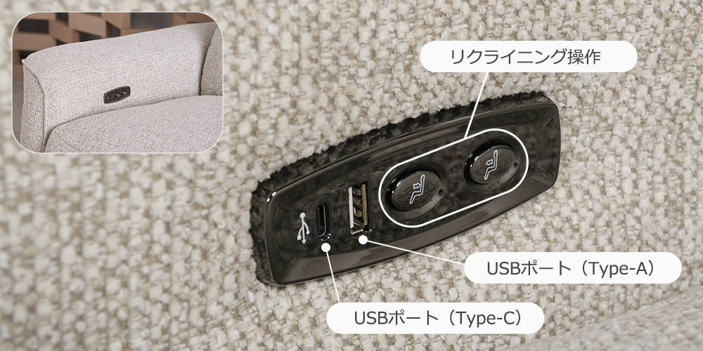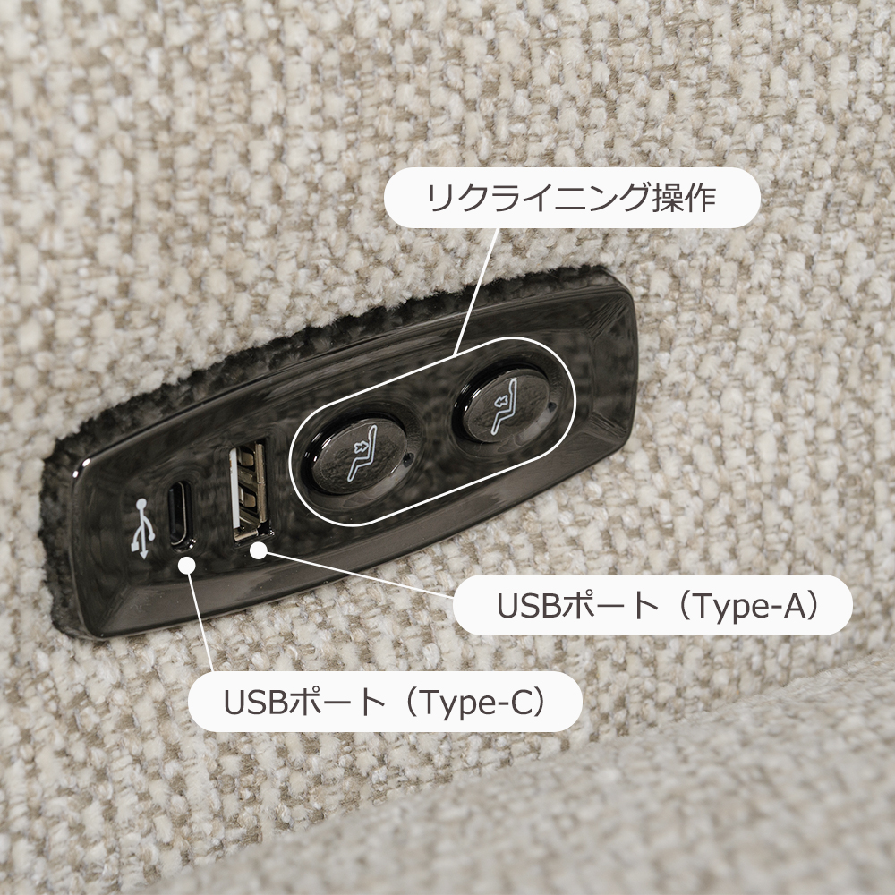 スイッチは肘の内側にあるため、小柄な方や座った状態でも手が届きやすい設計になっています。充電用USBポートにはAタイプとCタイプの差込口があり、リラックスしながらスマートフォンやタブレットの充電も行えて便利です。