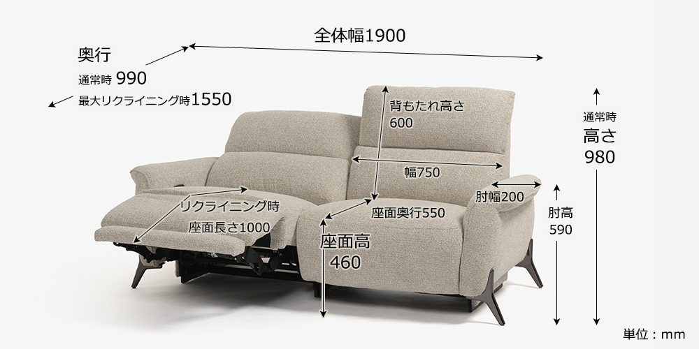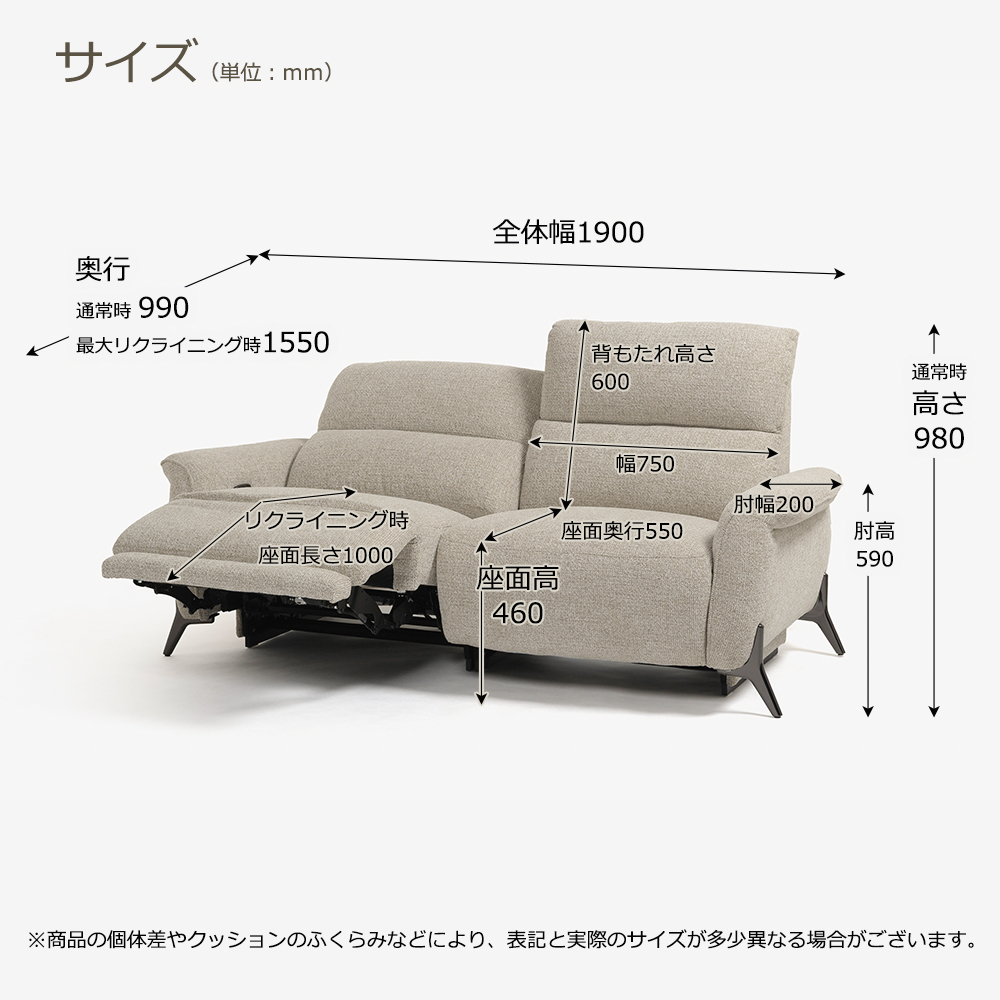 ※壁際にソファを設置する際は、約10cmほど後ろにリクライニングスペースが必要となります。※ご使用には、電源用のコンセントが1口必要です。