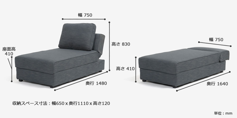 座面下には跳ね上げ式の大容量の収納スペースを備えています。収納スペース寸法:幅650x奥行1110x高さ120mm