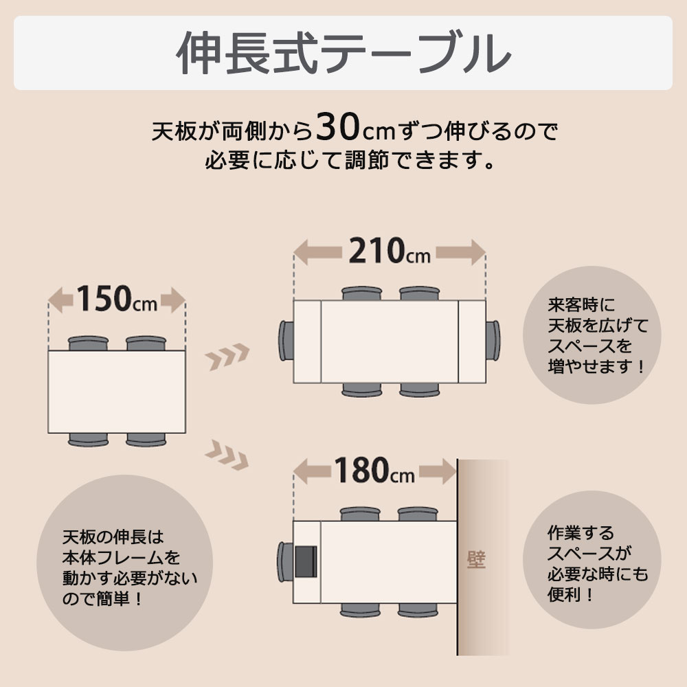 両サイドのバタフライ天板を伸長することで最大幅210cmとなり、来客時や大皿、ホットプレートなど大きいものを置くのにも重宝します。天板をどちらか片側だけ伸ばした幅180cmは、PC作業などちょっとした作業スペースに便利で使い勝手が良く、多様な使い方が可能です。