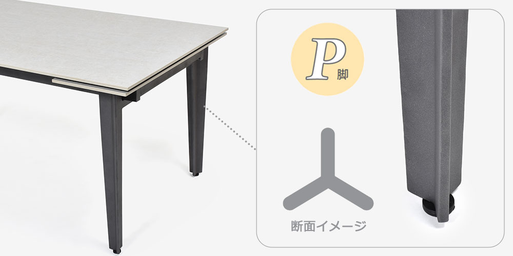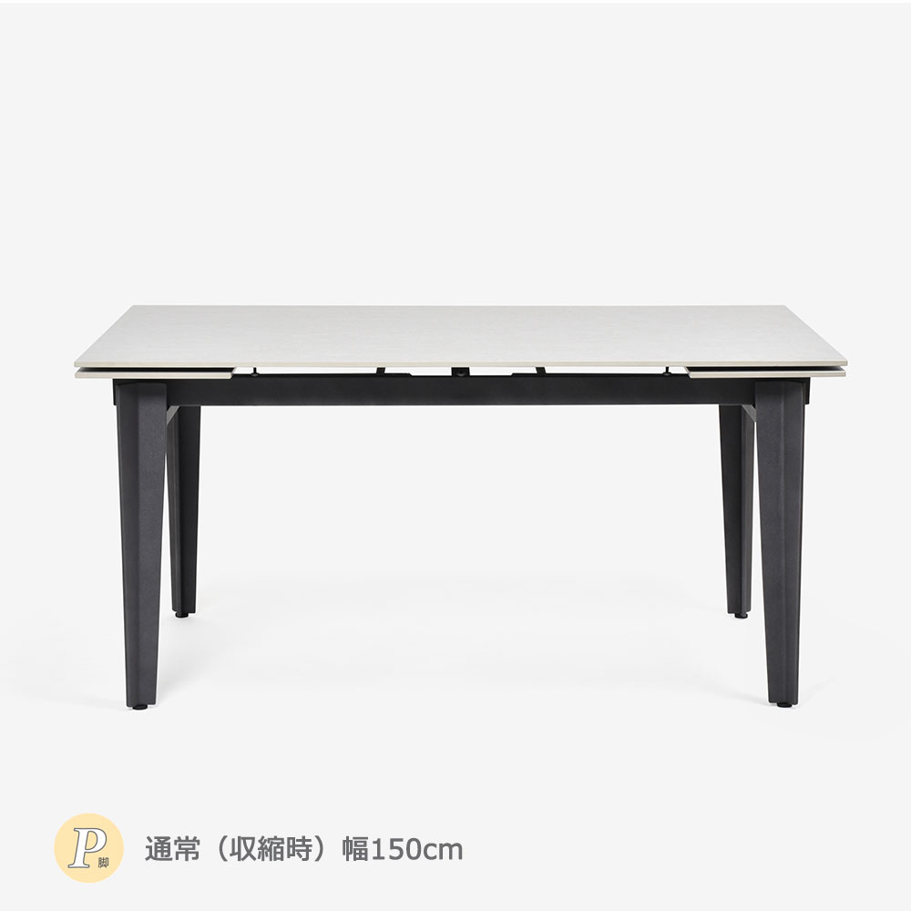 洗練されたデザインと機能性が一体化したセラミックテーブルです。※画像はP脚タイプの通常時幅150cmのイメージです。