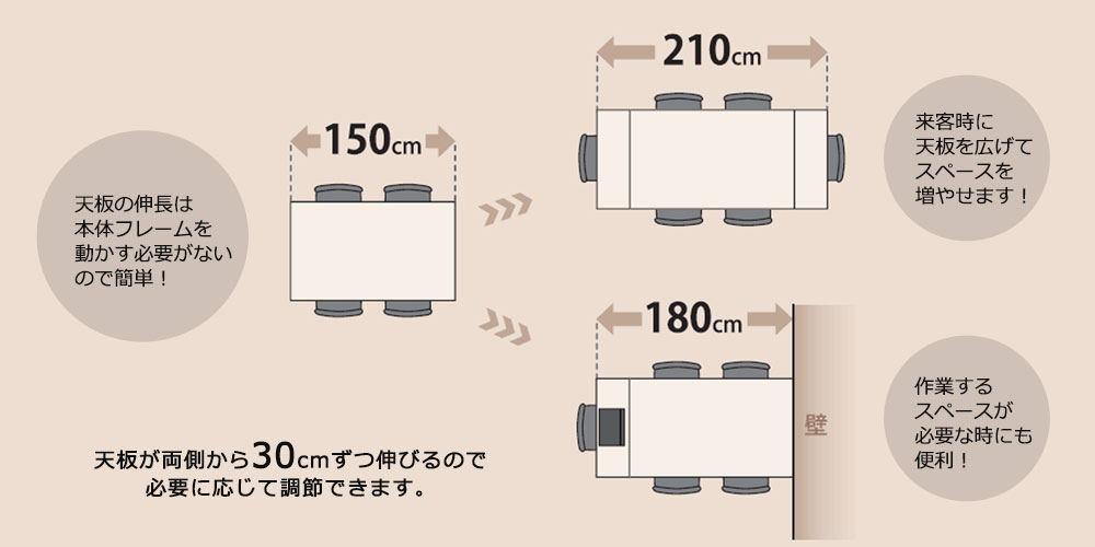 ※画像はP脚タイプの両側伸長時(幅210cm)のイメージです。