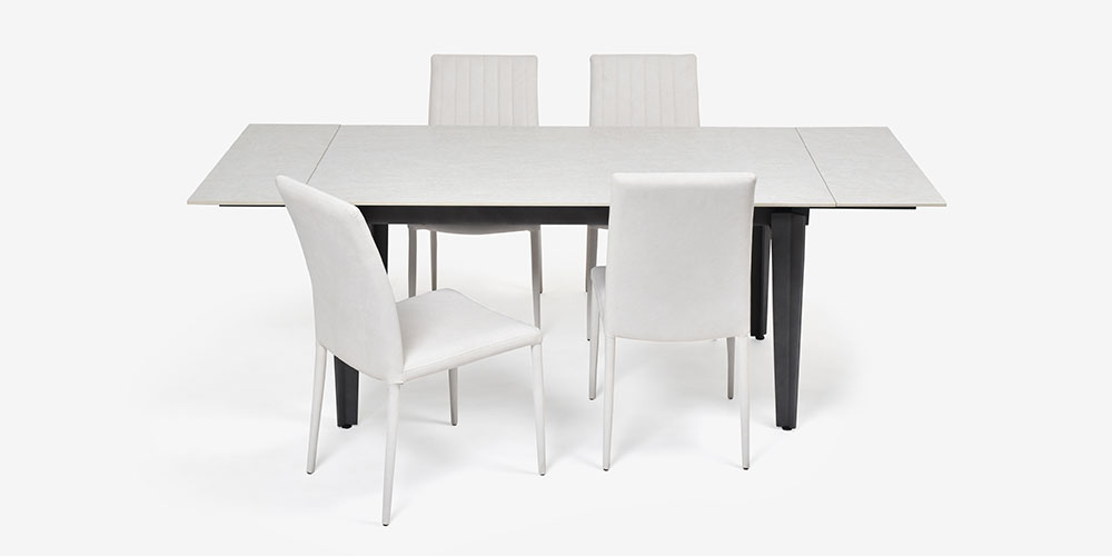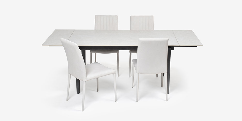 ダイニングシリーズ「レフ」の伸長式セラミックテーブルと布張りチェア4脚のセットです。モダンなセラミックと柔らかなファブリックの異素材を清涼感のあるホワイトで上品にまとめたスタイリッシュなコーディネートです。テーブルは脚デザインを2タイプ(P脚・F脚)からお選びいただけます。※画像はF脚タイプの両側伸長時(幅210cm)のイメージです。
