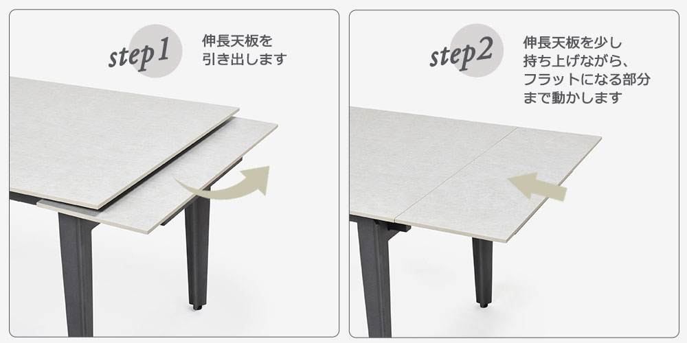 伸長方法は天板下に収納された伸長用天板を引き出し、持ち上げるようにしながら天板とフラットになる部分まで動かすだけの簡単な操作です。