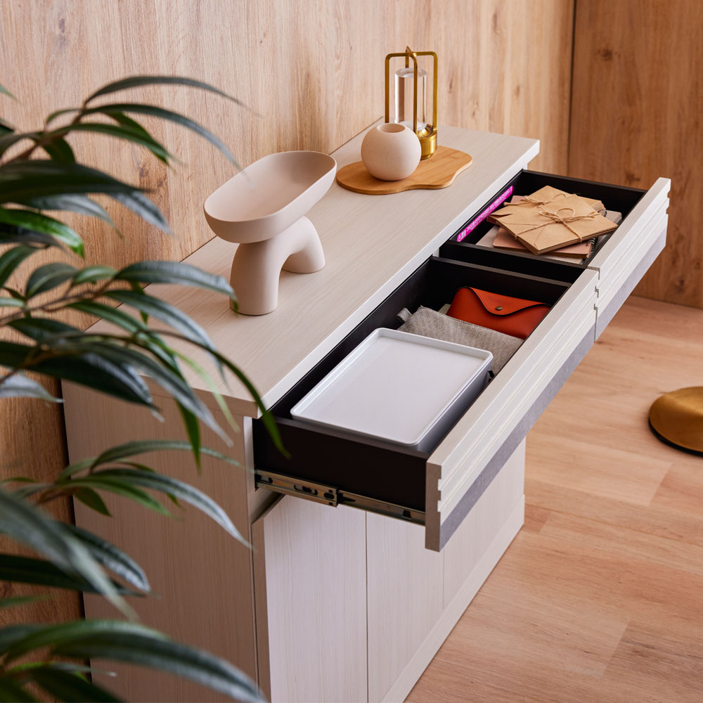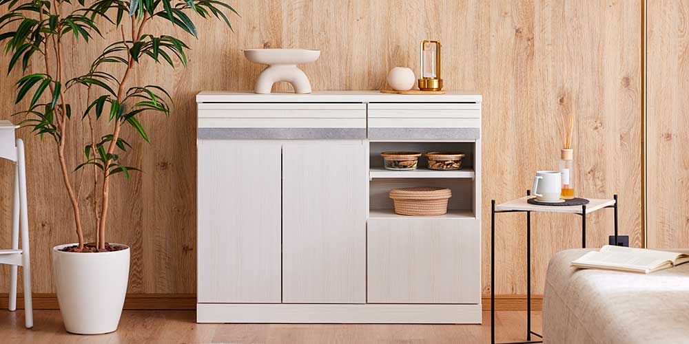 置く場所を選ばない、スリムな奥行きのサイドボード。キッチンのカウンター下、通路や寝室にも、ちょっとしたスペースに収納を設けることができます。シンプルなデザインで暮らしに溶け込み、4色のカラーからお部屋の雰囲気やお好みに合わせて選べます。