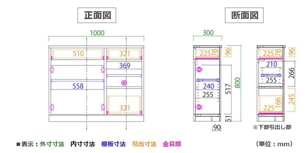 右下部分には書類や雑誌の収納に便利な、高さの深い引出しを設けています。