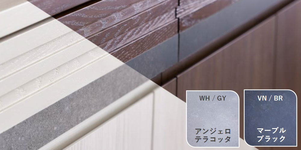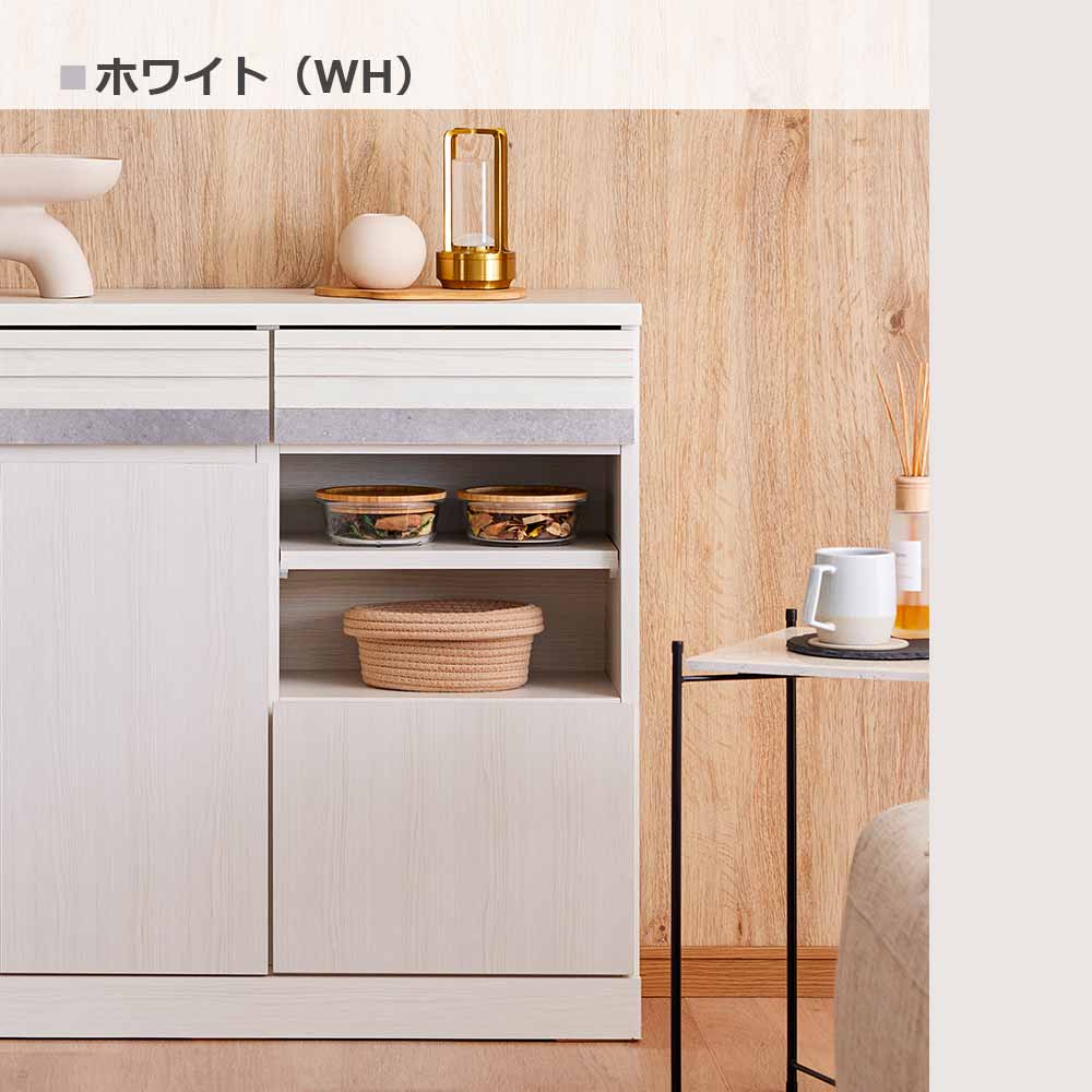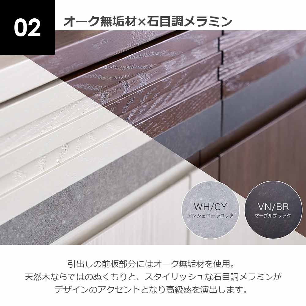 引出しの前板部分にはオーク無垢材を使用。 天然木ならではのぬくもりと、スタイリッシュな石目調メラミンがデザインのアクセントとなり高級感を演出します。石目調メラミンのカラーは、木目部分のカラーがはホワイト(WH)とグレー(GY)はアンジェロテラコッタ、ヴィンテージナチュラル(VN)とブラウン(BR)はマーブルブラックとなります。
