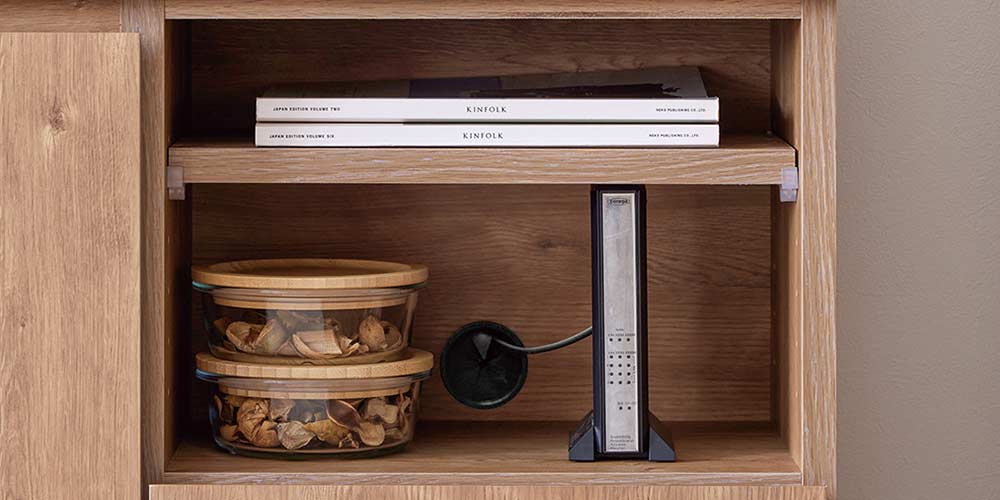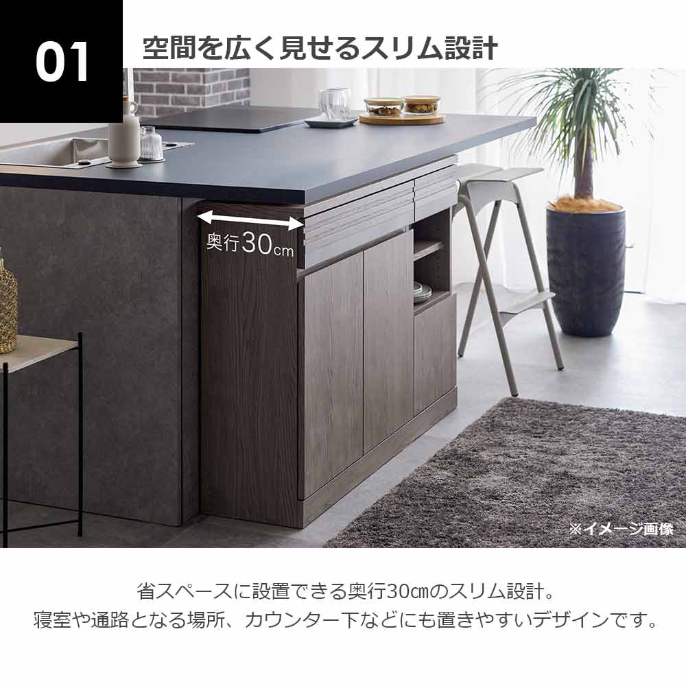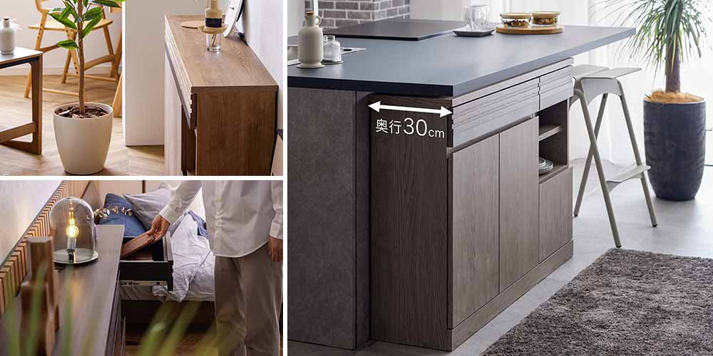 省スペースに設置できる奥行30?のスリム設計。寝室や通路となる場所、カウンター下などにも置きやすいデザインです。