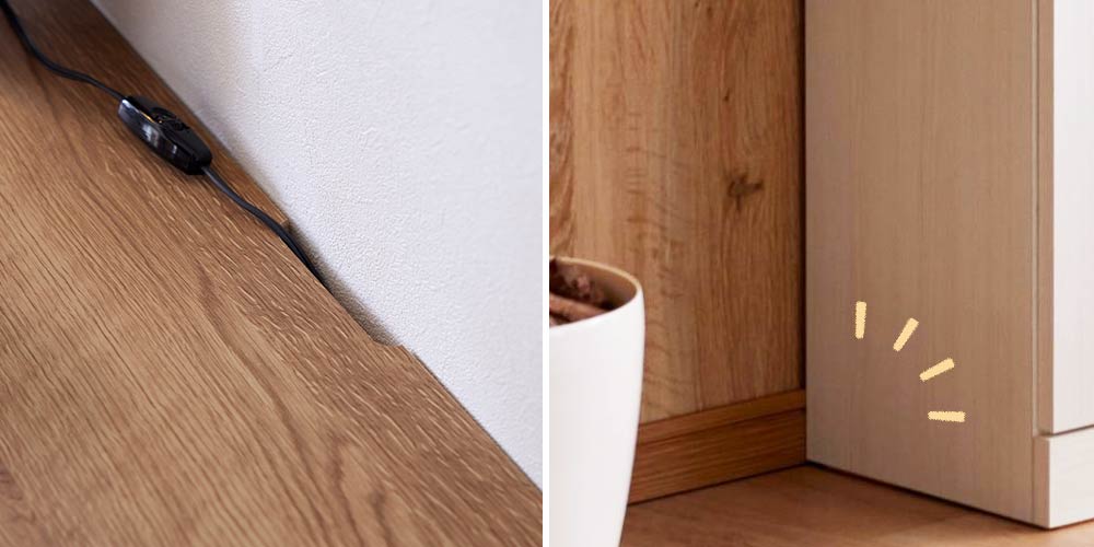 天板には配線用のコードスペーサー、側面には巾木よけを設けているので、壁にピッタリ設置できます。