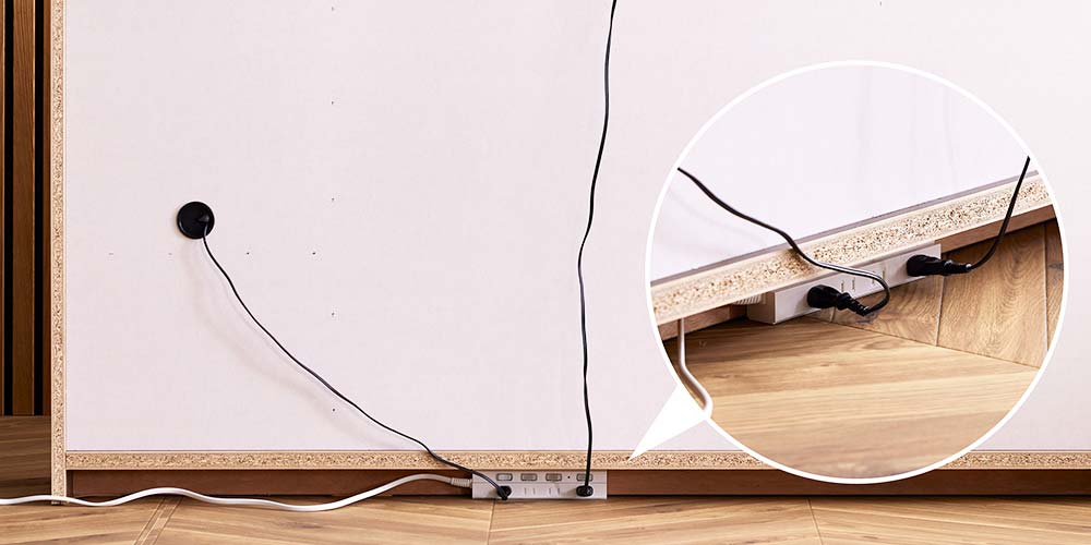 背面下部に電源タップスペースを設けているので、見せたくないコード類を隠しながらスッキリとまとめられます。