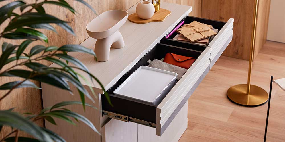 使いやすい高さに、中が見やすく物の出し入れがしやすいフルオープン仕様の引出しを設けています。たくさん物を入れても、軽い力でスムーズに引き出せます。