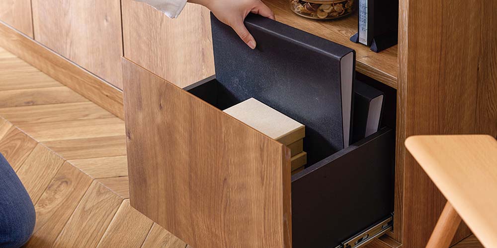 右下部分には書類や雑誌の収納に便利な、高さの深い引出しを設けています。
