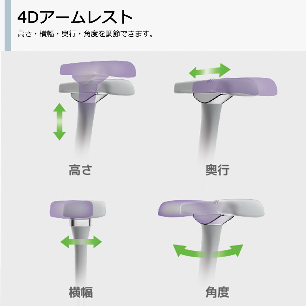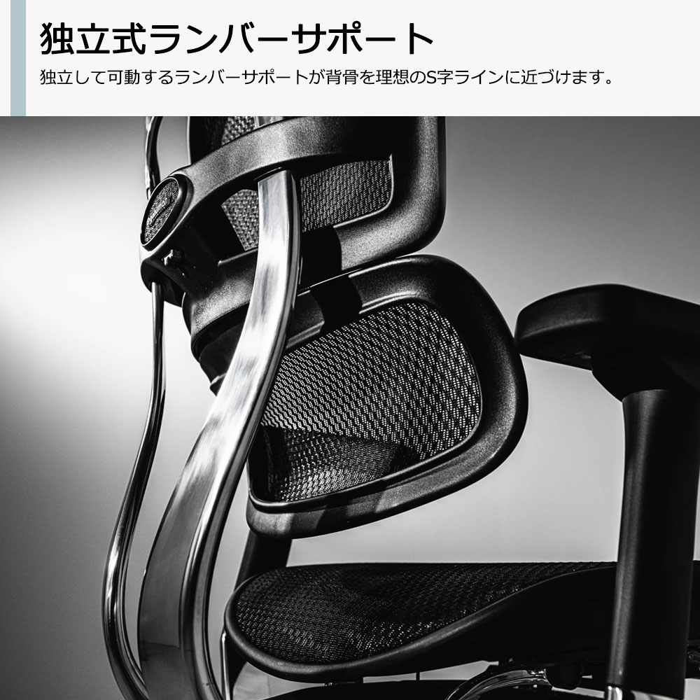 エルゴヒューマン最大の特徴である独立式のランバーサポート。立ち姿の状態での自然な背骨のラインを座った状態でも保つ機能です。ランバーサポートの硬さは調節ができます。