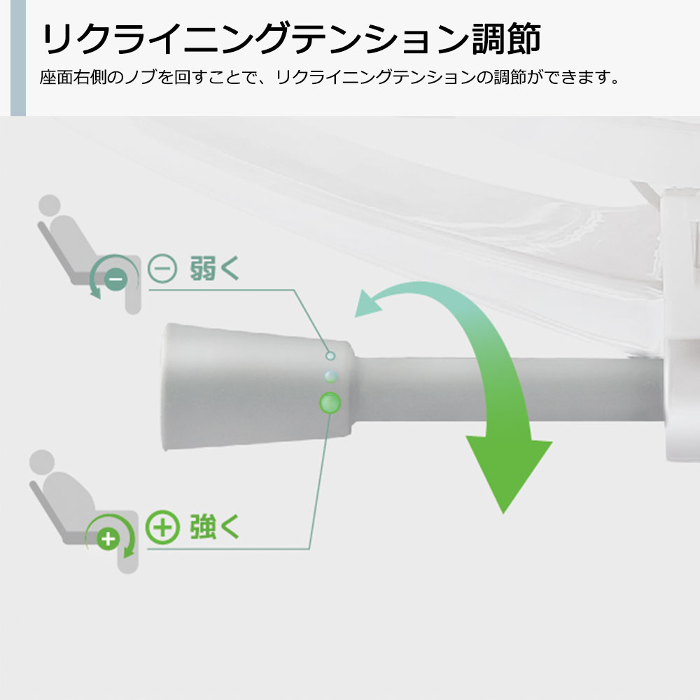 座面の高さ調節、リクライニング(メモリーロッキング)、座面の奥行調節が、座面右側の手元レバー1本で直感的に操作できます。
