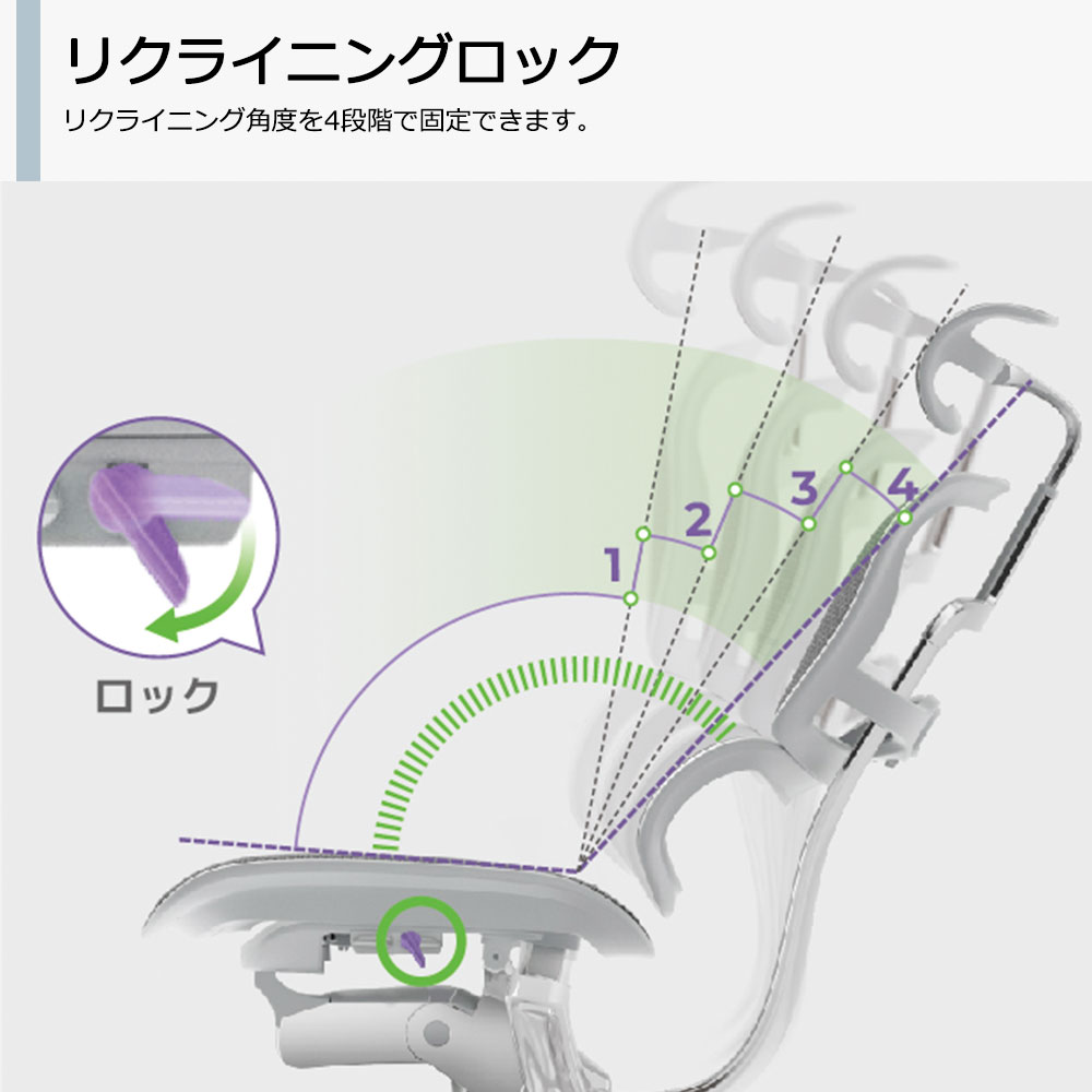 リクライニング角度を4段階で固定できる「リクライニングロック」に加え、新機能「メモリーロッキング」を搭載したDR(ダブルリクライニング)モデルです。