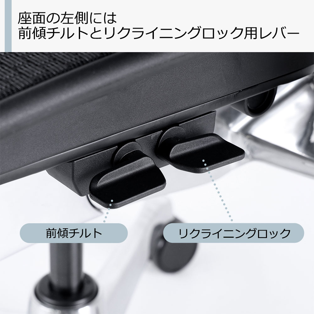 座面左側では、前のレバーで前傾チルト、後ろのレバーでリクライニングロックが操作できます。