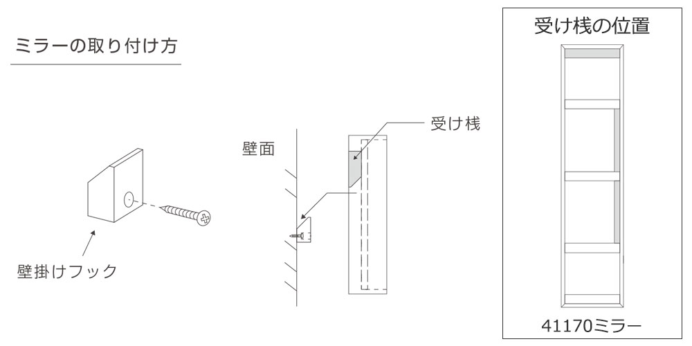 木製の壁掛けフックを使用して、ミラーを壁に取り付けられます。本体の受け部分にかみ合うように固定するため、壁にぴったり取り付けることができます。