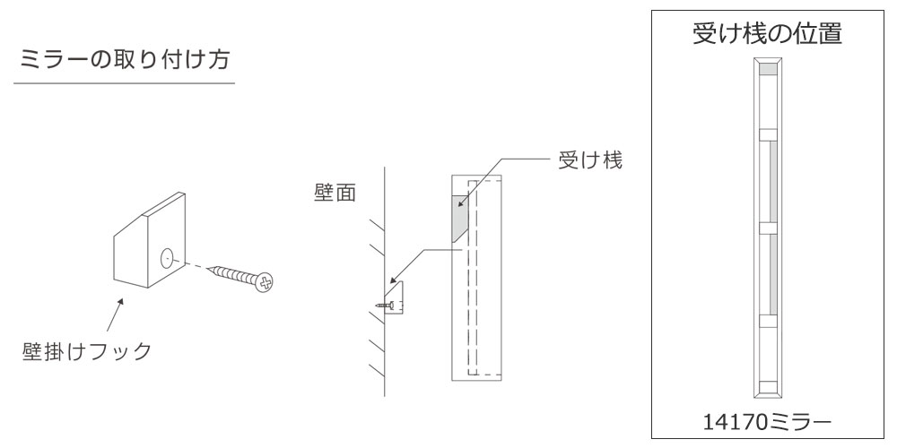 木製の壁掛けフックを使用して、ミラーを壁に取り付けられます。本体の受け部分にかみ合うように固定するため、壁にぴったり取り付けることができます。