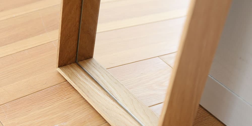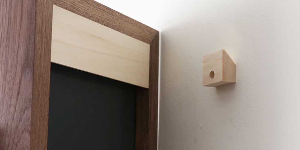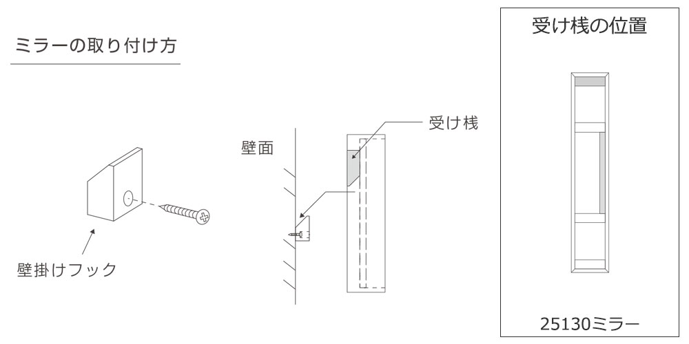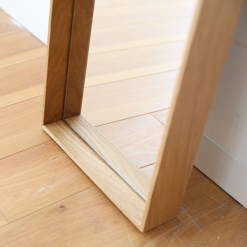 木製の壁掛けフックを使用して、ミラーを壁に取り付けられます。本体の受け部分にかみ合うように固定するため、壁にぴったり取り付けることができます。