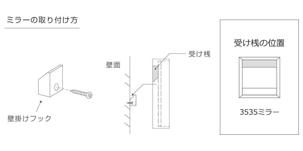 木製の壁掛けフックを使用して、ミラーを壁に取り付けられます。本体の受け部分にかみ合うように固定するため、壁にぴったり取り付けることができます。