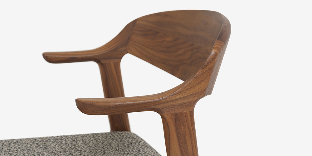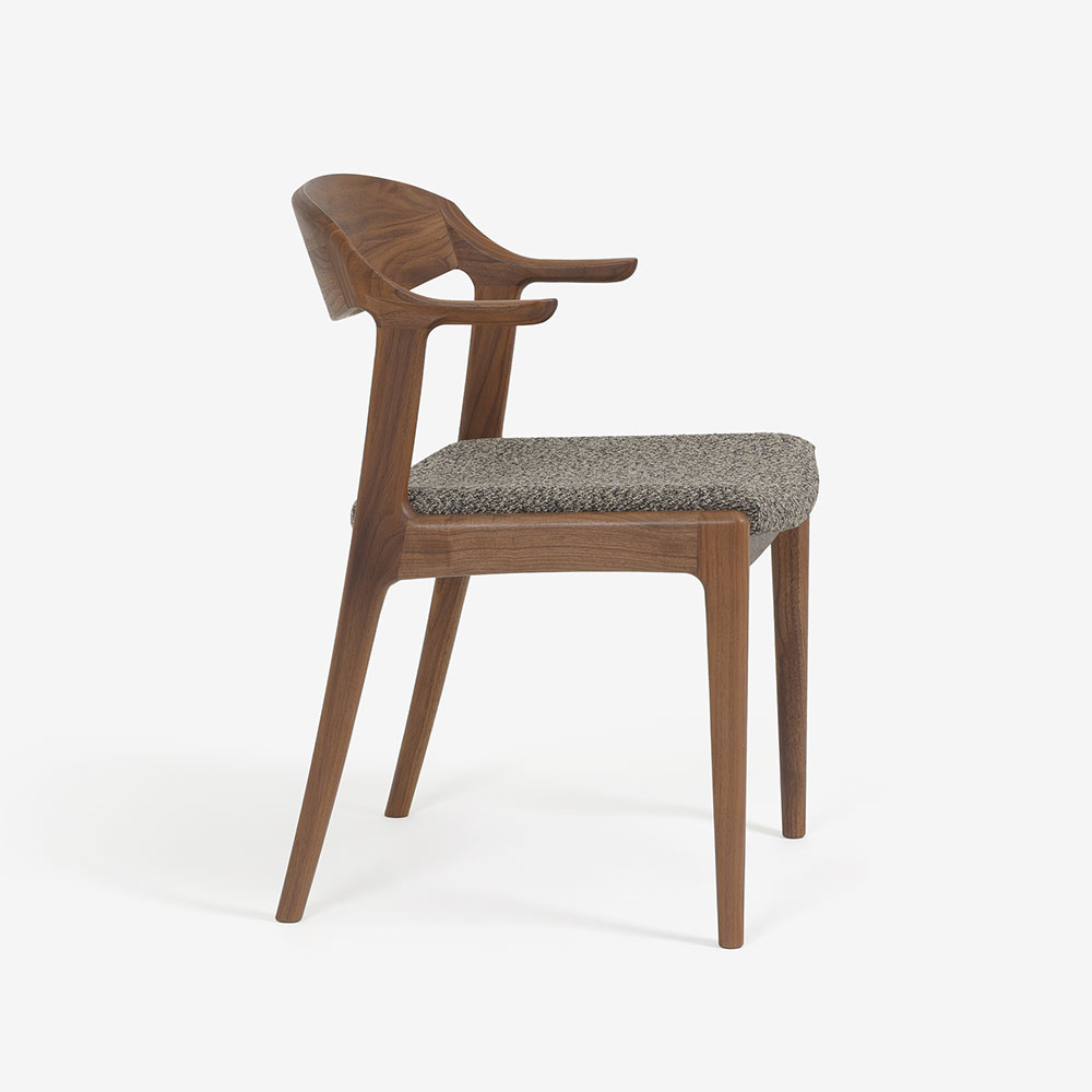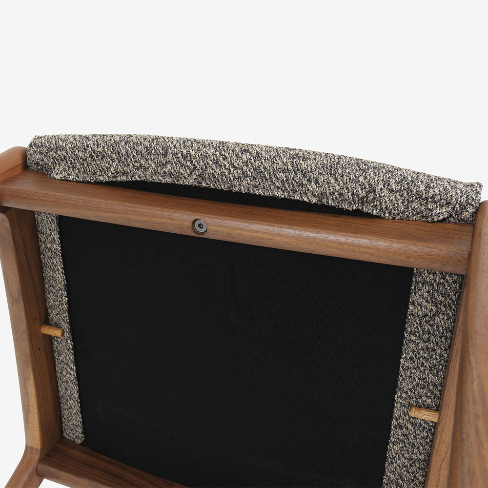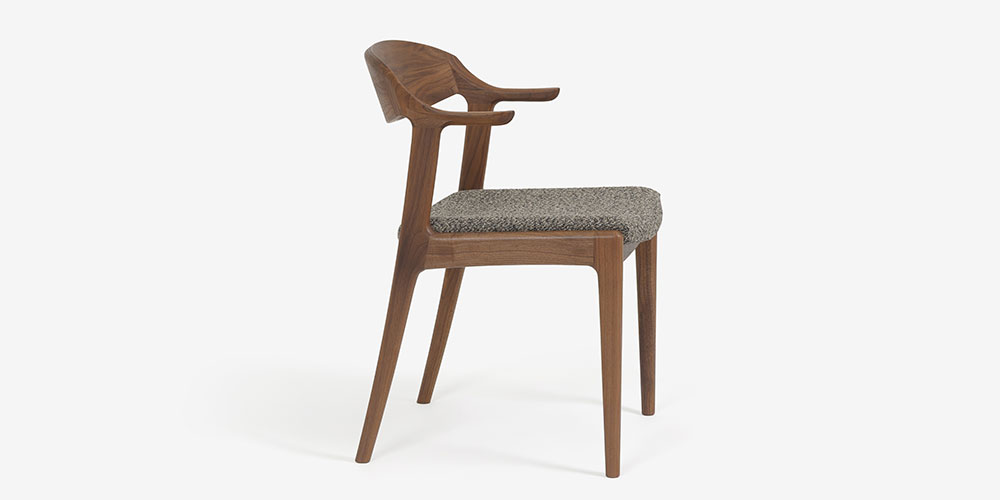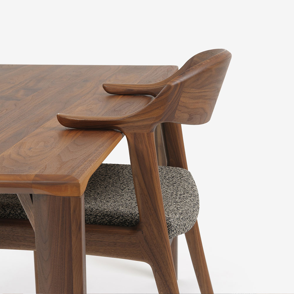 ウォールナット無垢材を使用しており自然な木の風合いをしっかりと感じることができるダイニングチェアです。ホールド感のある背もたれと座り心地、そして機能性を兼ね備えた、優れたチェアとなっています。※天然木を使用しているため、1点ごとに木目や色味は異なります。