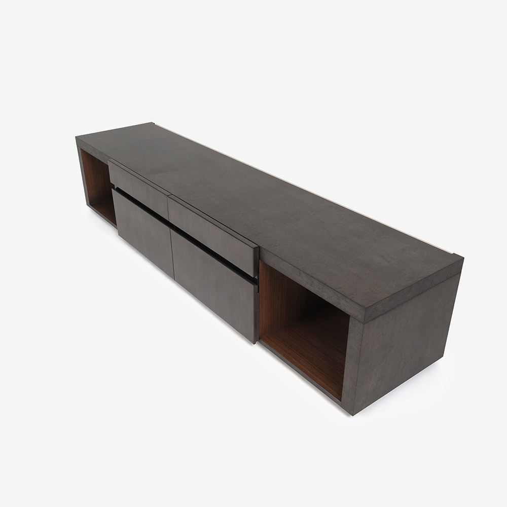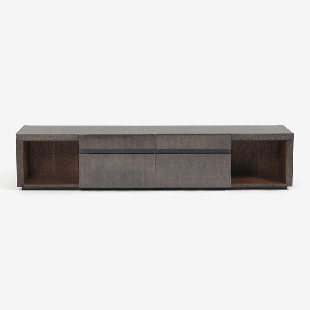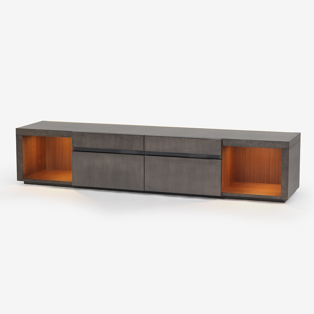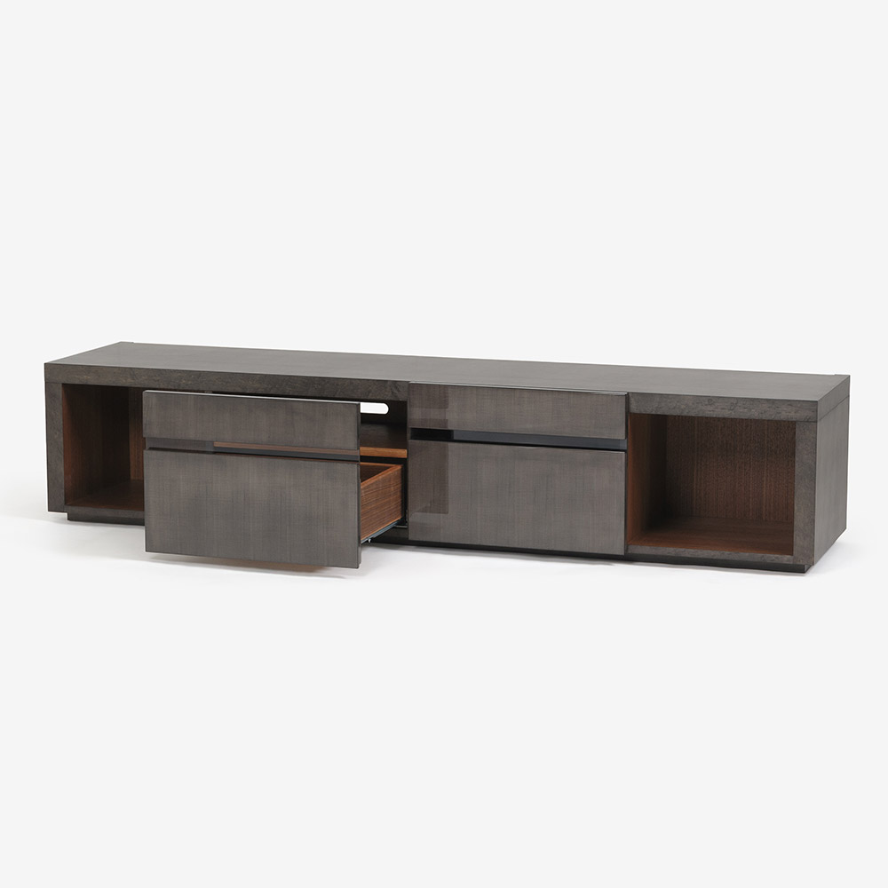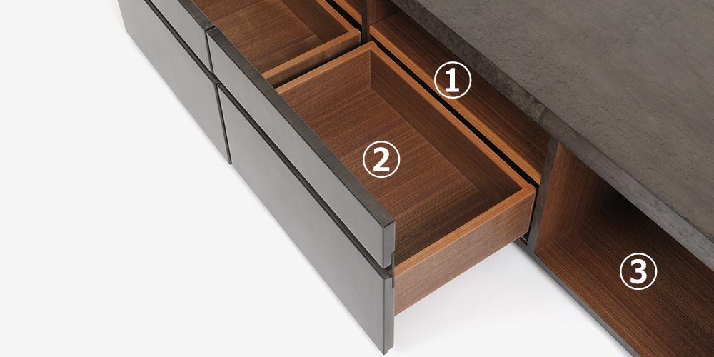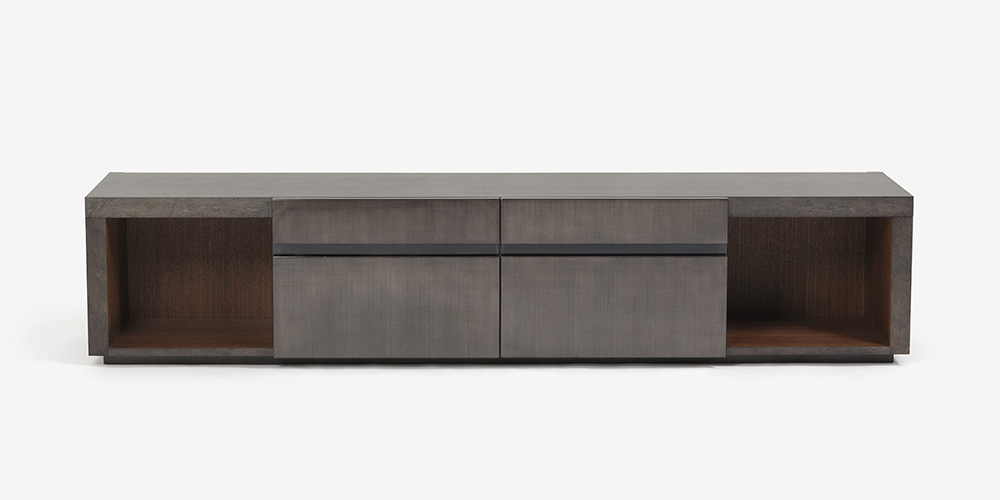 希少性の高いバーズアイメープル材、シカモア材、ウォールナット材の3種類の木材を使い、それぞれの美しい木目や特性を活かしてデザインされたテレビボード。本体に使用したバーズアイメープルはマットに仕上げることで落ち着いた上品な雰囲気を演出し、引出し前面に使用したシカモアは高級感のある鏡面仕上げに、オープン収納など収納部の内貼りに使用したウォールナットの色味や木目が全体のアクセントとなり、シンプルな中に個性のあるモダンなデザインです。
