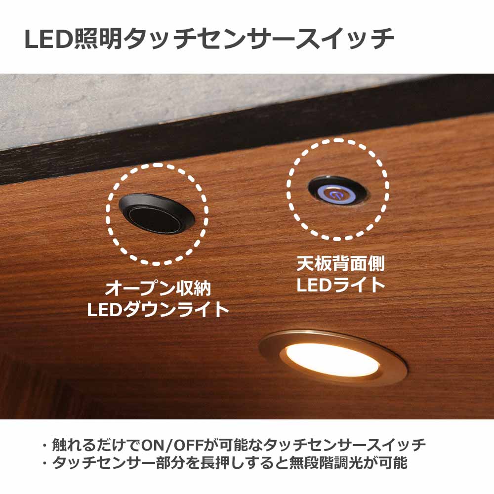 オープン収納部と天板背面側には調光機能付きのLED照明が付属しており、空間の間接照明としても楽しむことができます。