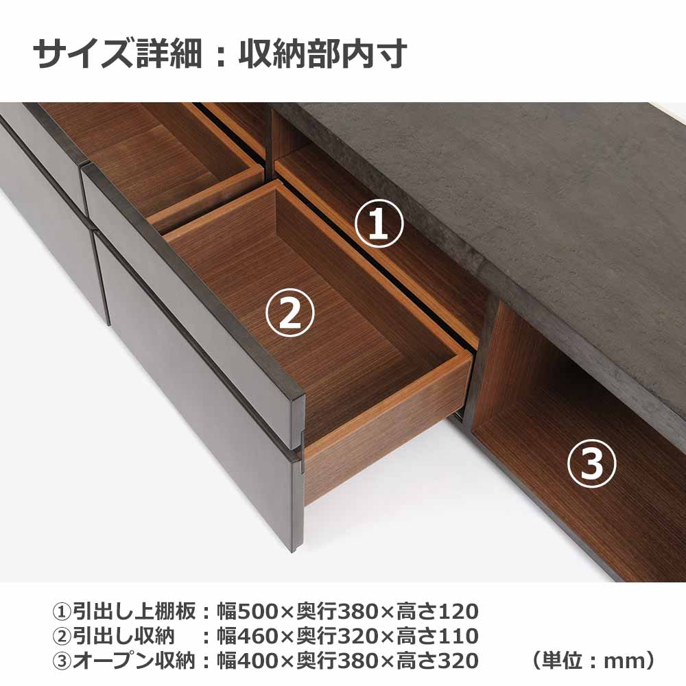 引出し前面は、シカモア材の鏡面塗装を施した高級感ある仕様。棚板収納にあたる部分にはガラスデザインを用い、機器を設置の際にリモコン操作ができるよう実用性にも配慮しています。また、引出しはゆっくり閉まるソフトクローズ機能がついています。