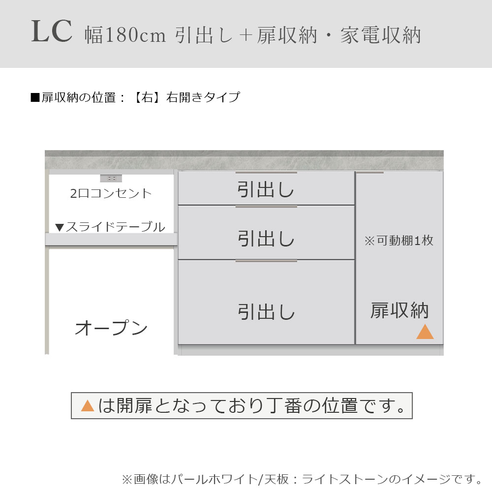 作業台スペースを最大限に活用できるカウンタースタイル【引出し+扉収納(扉:向かって右[右開き])・家電収納】幅180cmタイプ
