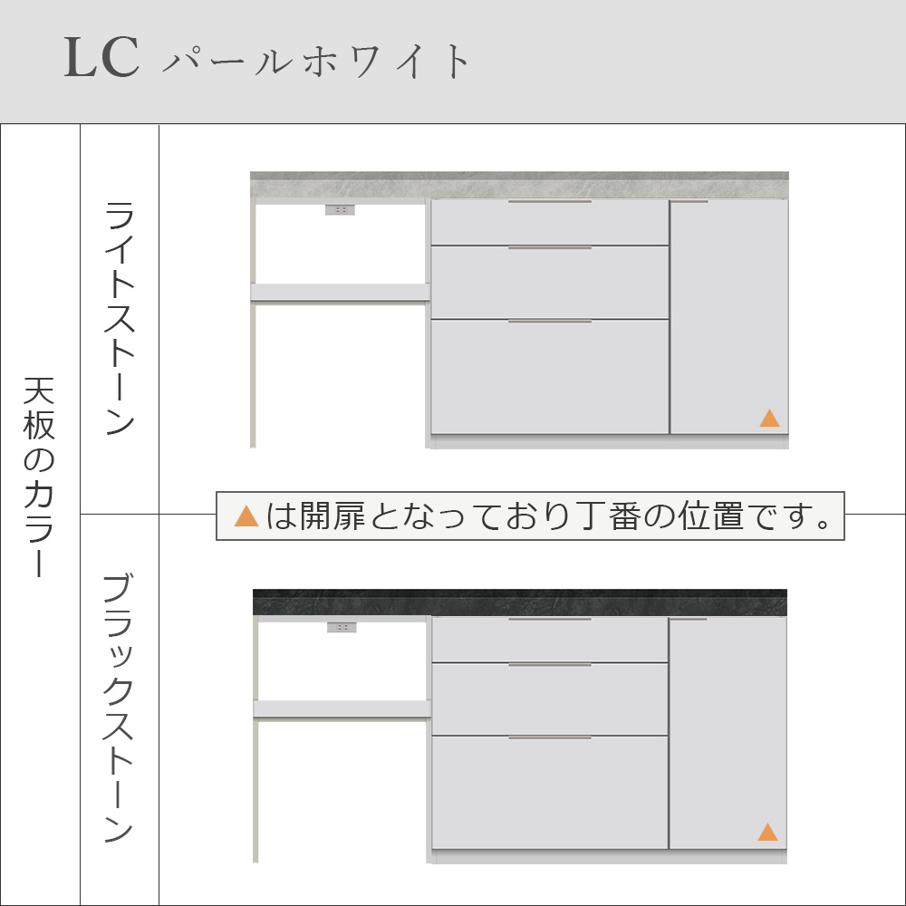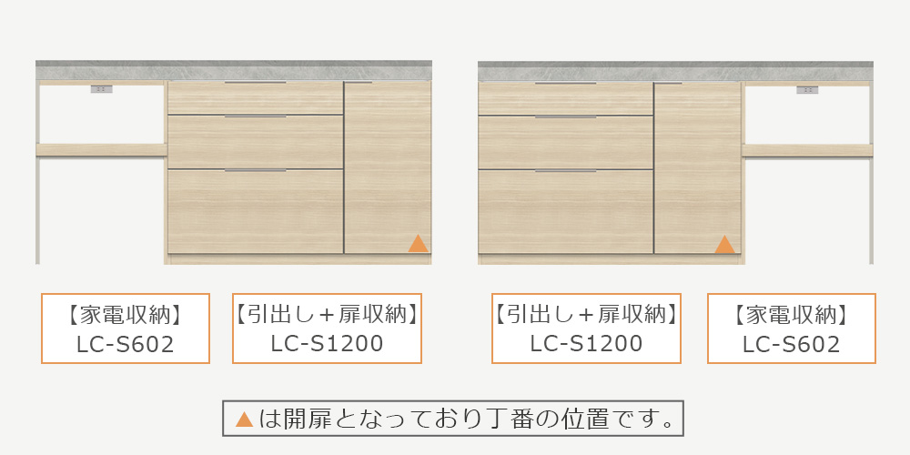 お部屋の間取りに合わせて「引出し+扉収納」と「家電収納」の位置を左右で選べます。※画像はLCシリーズのイメージです。