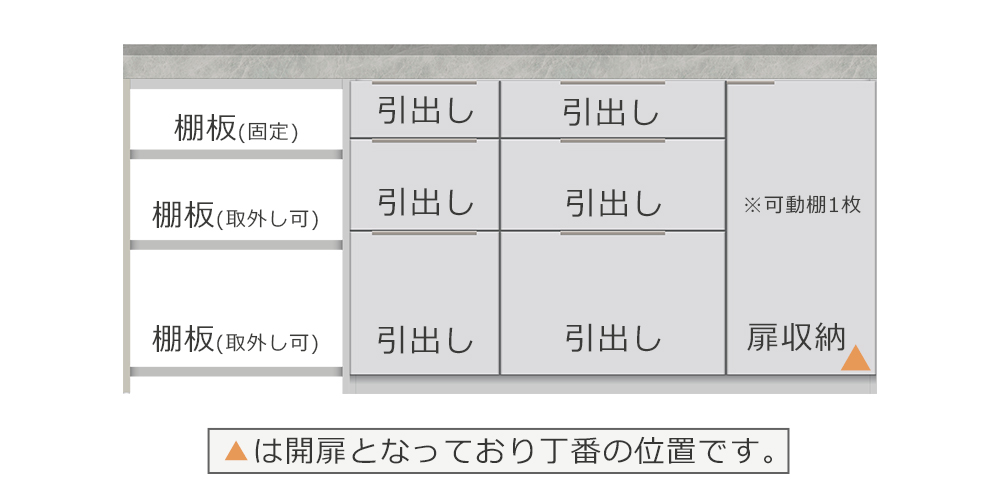 【扉収納】扉内は可動棚(1枚)付きで収納するものに合わせて30mmピッチで棚の調整が可能です。(ソフトクローズ仕様)