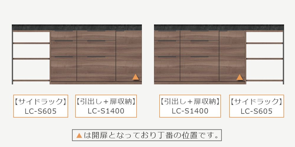 お部屋の間取りに合わせて「引出し+扉収納」と「サイドラック」の位置を左右で選べます。※画像はLCシリーズのイメージです。