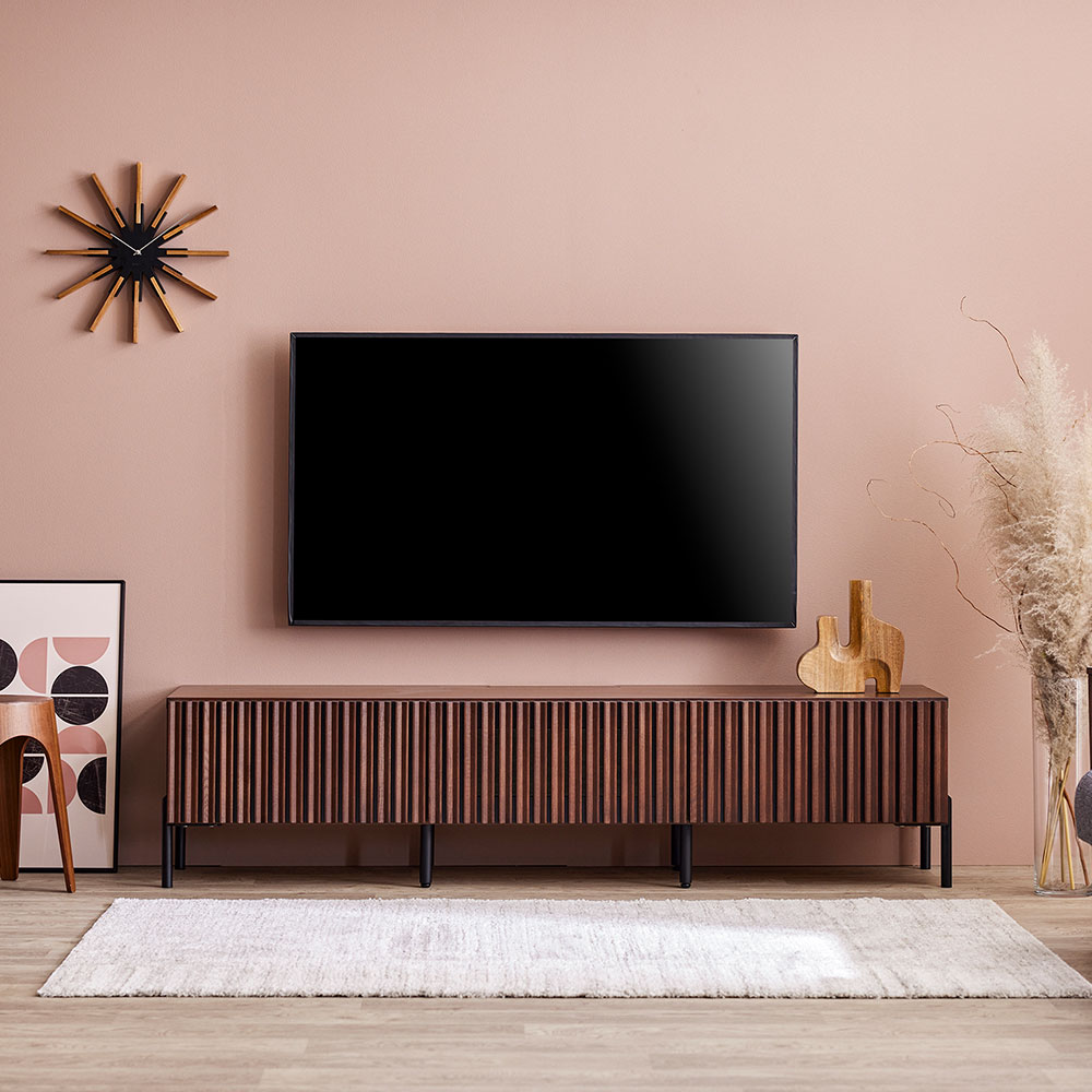 「Luke2 ルーク2」シリーズのテレビボードは、オーク無垢材を前面に贅沢に使用しています。職人が1本1本、えぐり面形の磨きをかけることで陰影が強調され、自然光/照明の当たり方によっても表情を変えます。※画像はイメージです。テレビは別売りです。