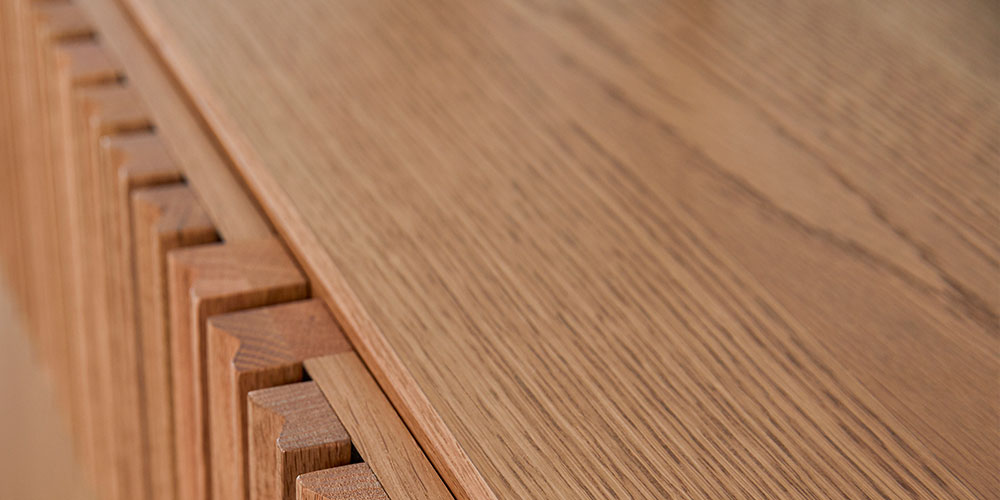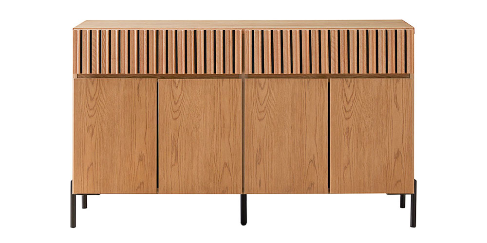 「Luke ルーク」シリーズのサイドボードは、前面の格子部分にオーク無垢材を贅沢に使用しています。職人が1本1本、えぐり面形の磨きをかけることで陰影が強調され、自然光/照明の当たり方によっても表情を変えます。※天然木の為、木目や色味は一点ごとに異なります。※画像は「150サイドボード」のイメージです。