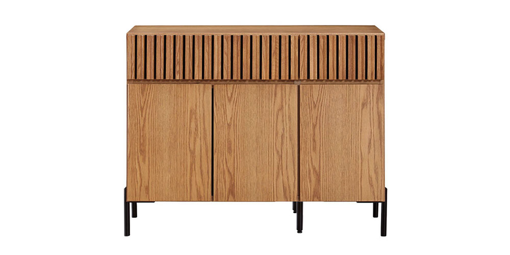 前面の無垢材をV字にカットした格子パーツと、トレンド感のある「木×異素材」のコンビネーションが目を惹きます。高さ85cmと腰高程の高さで、お気に入りのアイテムを置く飾り棚としても活躍します。