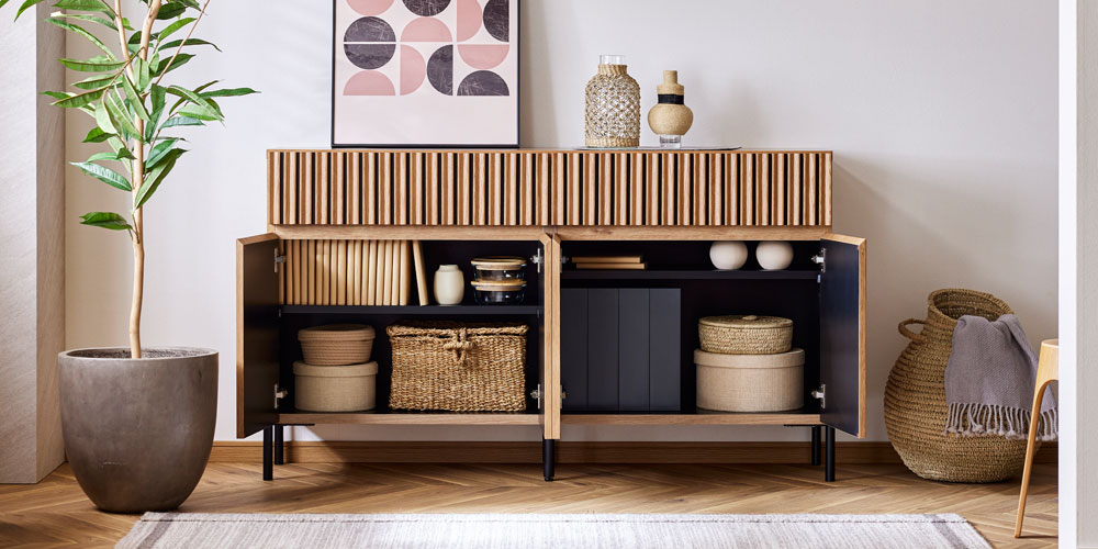 サイドボードは引出収納と扉収納を組み合わせており、扉内には30mmピッチで調整できる可動棚を設けています。A4サイズ収納や小物収納等、使い分けしやすい収納スペースも魅力です。※画像は「150サイドボード」のイメージです。