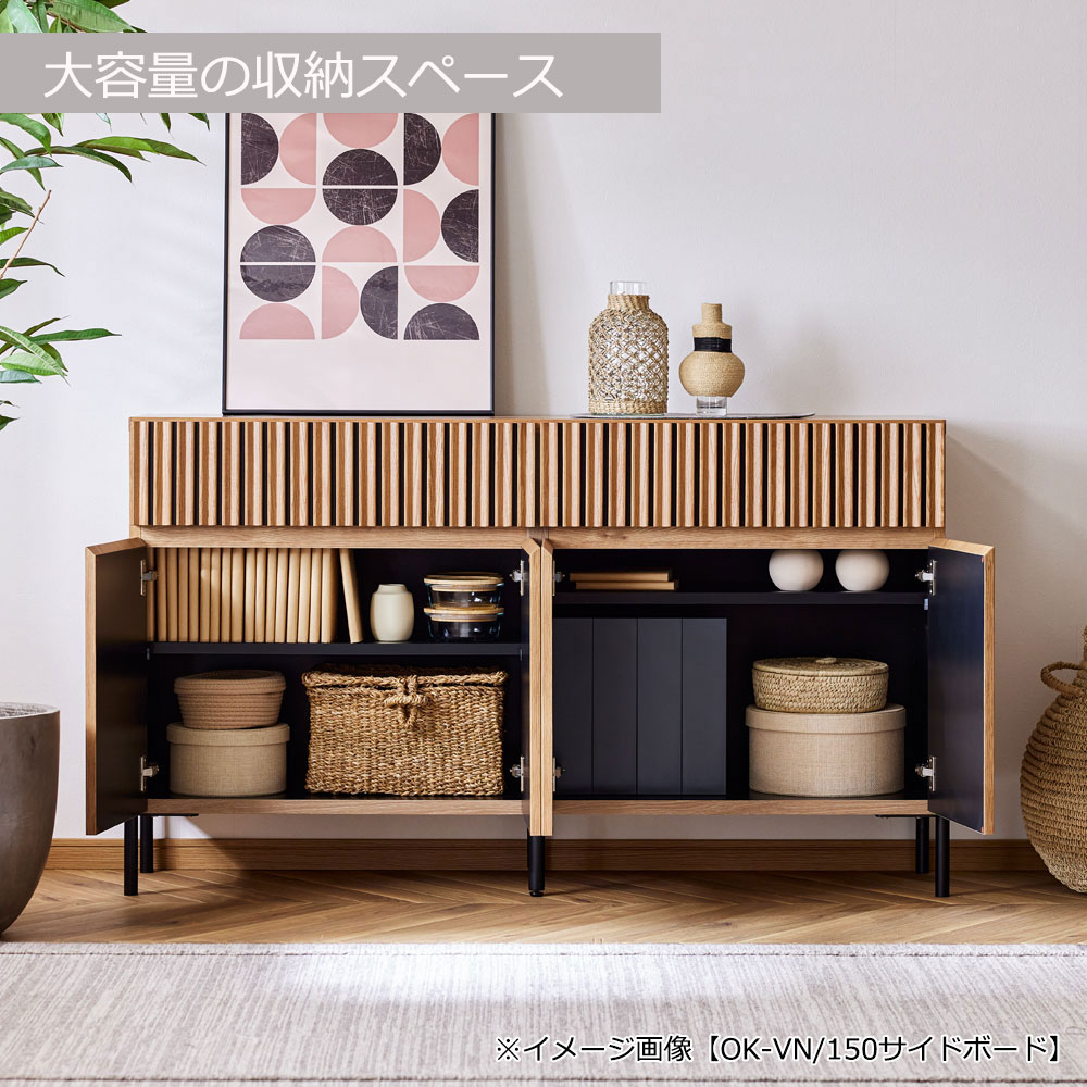 サイドボードは引出収納と扉収納を組み合わせており、扉内には30mmピッチで調整できる可動棚を設けています。デザイン面だけではなく、A4サイズ収納や小物収納等、使い勝手が良い収納面も魅力です。※画像は色違い「150サイドボード」/OK-VN(オークヴィンテージナチュラル)色のイメージです。