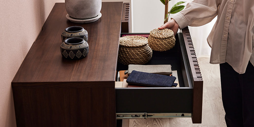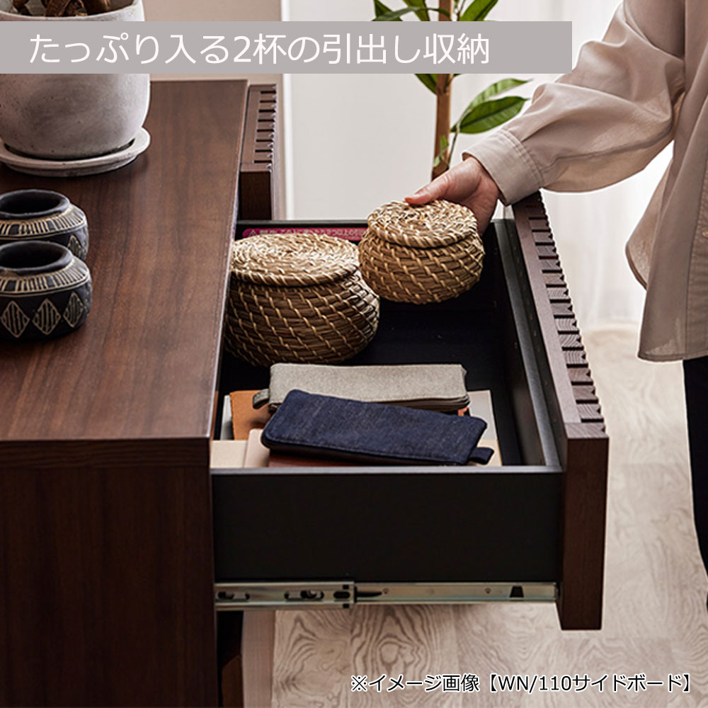 小物や雑貨の収納にぴったりな2杯の引出し収納は、フルスライドレールを採用しており奥のものまでしっかり取り出せます。※画像は「110サイドボード」のイメージです。