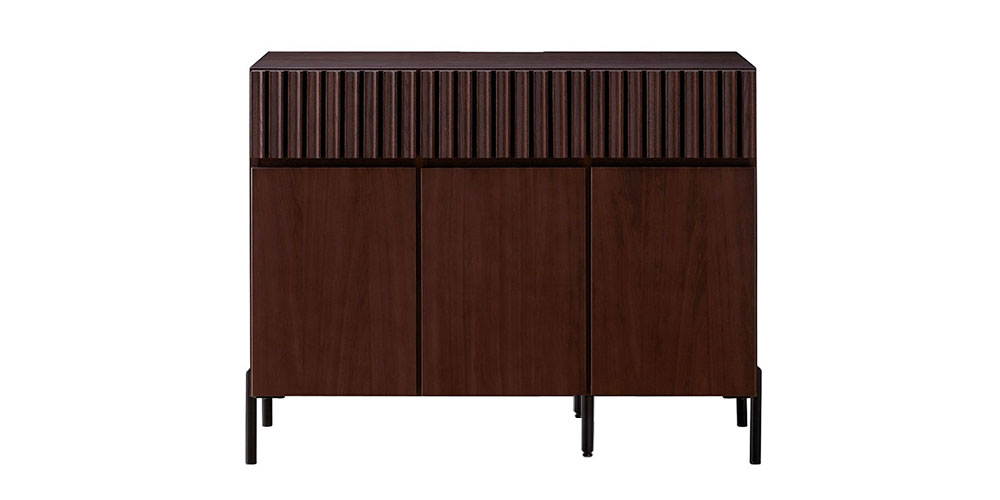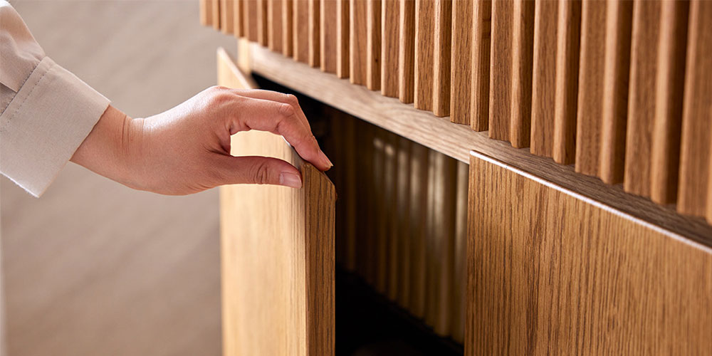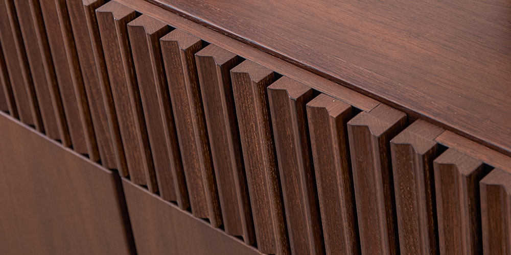 「Luke ルーク」シリーズのサイドボードは、前面の格子部分にオーク無垢材(ウォールナット色に着色)を贅沢に使用しています。職人が1本1本、えぐり面形の磨きをかけることで陰影が強調され、自然光/照明の当たり方によっても表情を変えます。※画像は「110サイドボード」のイメージです。