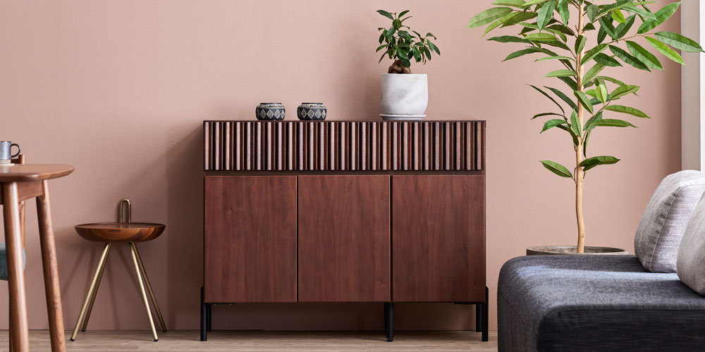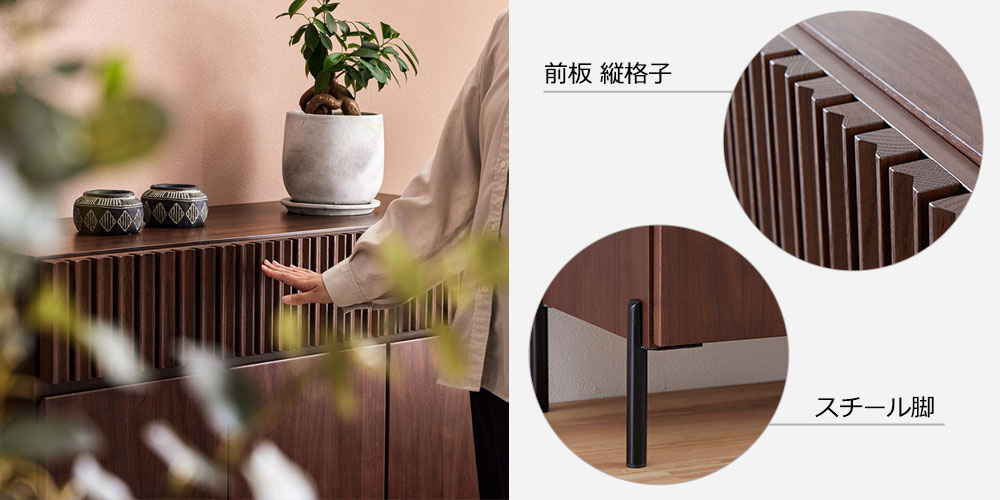 前面の無垢材をV字にカットした格子パーツと、トレンド感のある「木×異素材」のコンビネーションが目を惹きます。高さ85cmと腰高程の高さで、お気に入りのアイテムを置く飾り棚としても活躍します。