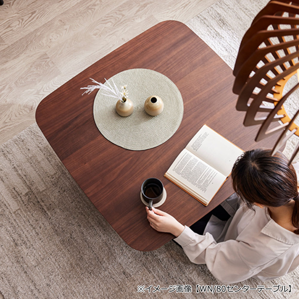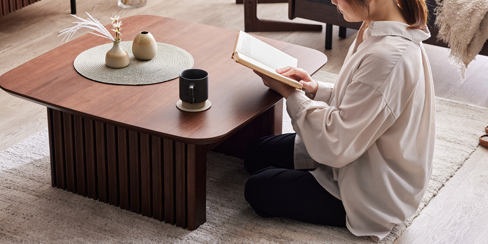 天板高さを36cmに抑え、脚や棚板は天板より内側にすることで、床で座って過ごすスタイルでも使いやすいように設計しています。※画像は「80センターテーブル」のイメージです。