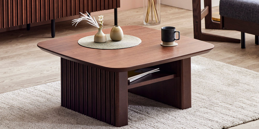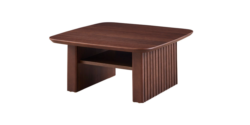 天板と本体にウォールナット材突板、脚部側面の格子にはオーク無垢材(ウォールナット色に着色)を贅沢に使用しています。職人が1本1本、えぐり面形の磨きをかけることで陰影が強調され、自然光/照明の当たり方によっても表情を変えます。※天然木の為、木目や色味は一点ごとに異なります。※画像は「80センターテーブル」のイメージです。