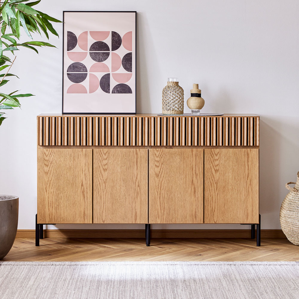 シンプルなデザインながらも、本体の木目のやわらかな雰囲気と脚部のブラックアイアンとのコントラストが個性的で、スタイリッシュなサイドボード。細身の脚にして、さらに中央部分の脚をなくすことで、よりすっきりとした見た目に仕上がっています。