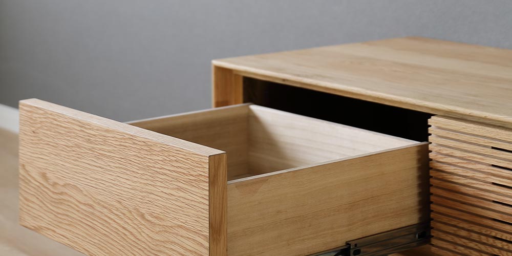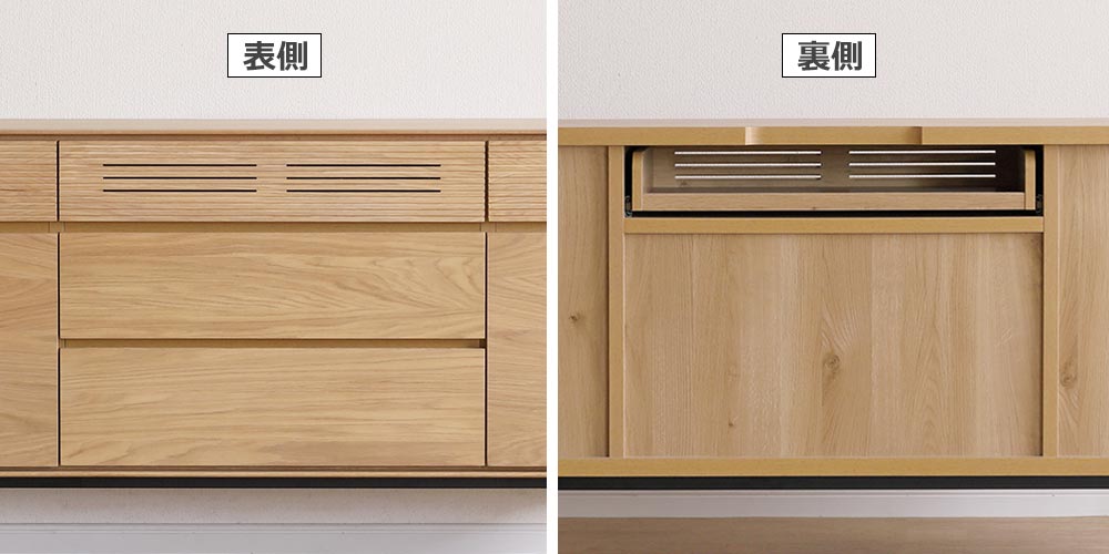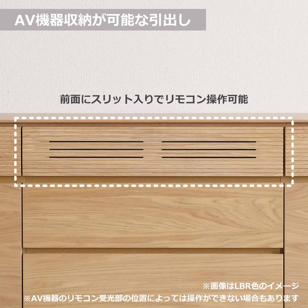 上段中央部の引出しは背面がオープンな仕様のため配線も可能で、AV周辺機器の収納ができます。引出し前面にはスリットが入っているので、扉を閉めたままリモコン操作が可能です。引出しの後方部には物の落下防止のため、1cmの立ち上がりがあります。