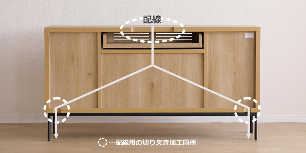 AV機器やテレビの配線用に、天板の背面側中央と下板の左右に配線加工(切り欠き)が施されています。配線が中央部に垂れて脚元がごちゃごちゃして見えることのないよう、スマートにまとめることができます。