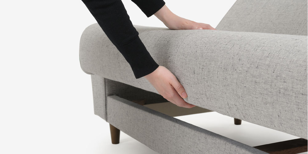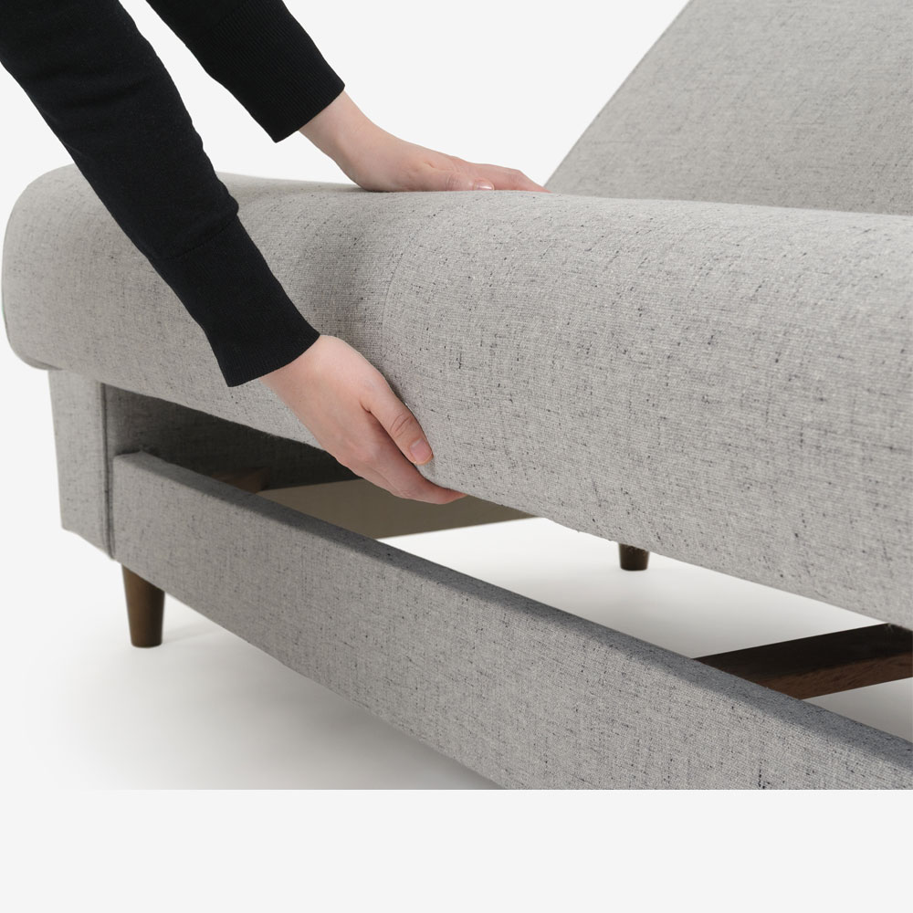 ソファからベッドへの切り替えは、座面シートを軽く持ち上げるだけの手軽な操作。ワンタッチでできるので、急な来客時にもすぐに準備できます。
